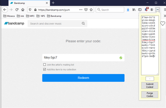 Yumify es una herramienta diseñada para facilitar la gestión de códigos de canje, especialmente en plataformas de música como Bandcamp. Este programa, que funciona como una extensión para Firefox, permite a los usuarios probar diferentes códigos hasta encontrar uno válido. Con una interfaz intuitiva, los usuarios pueden simplemente pegar los códigos y hacer clic en el botón 'Redeem' para acceder a la página de descarga correspondiente. Además, ofrece una función de 'Purge Codes' que permite eliminar los códigos ya utilizados, garantizando que solo se muestren los códigos disponibles para canjear.